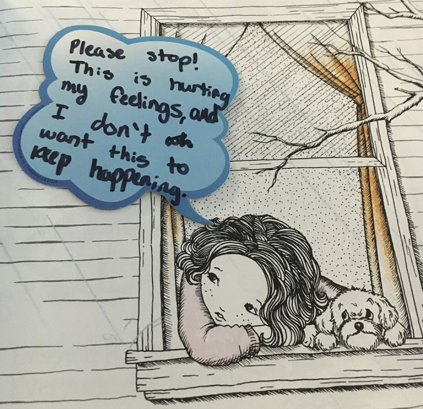 Using a post it note, bubble cut out from the Dollar Tree, or a hand out (differentiated for grade and class) we help Louisa find her voice.