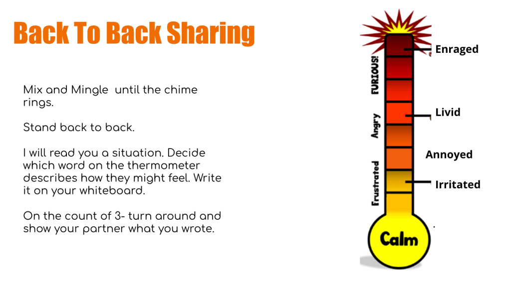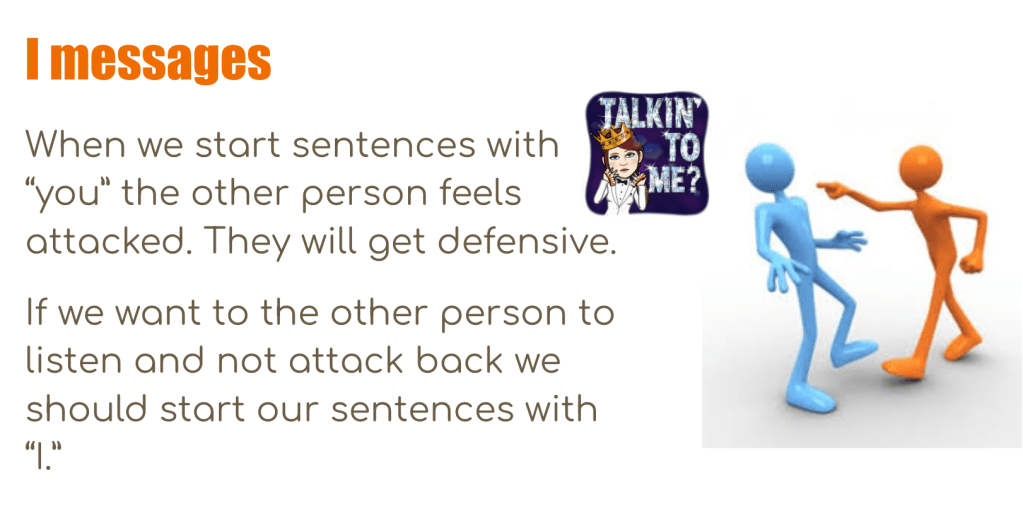 I introduce the idea of an I-message with examples and a video if time allows. This is the perfect opportunity to talk about things that she could say that would make the situation better or worse.
