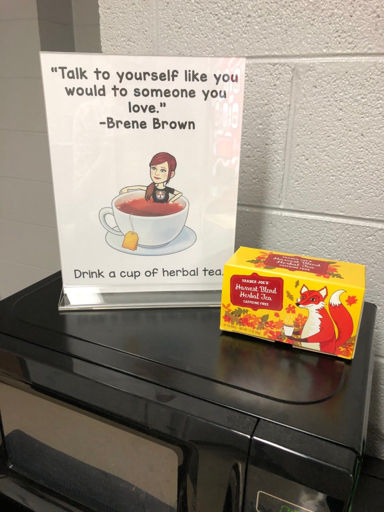 For National School Counselor Week I try to encourage teacher self-care and mindfulness by tapping into all their senses. Each day I put a mindful treat in the workroom along with a sign that explained its benefits and/or had an encouraging quote.