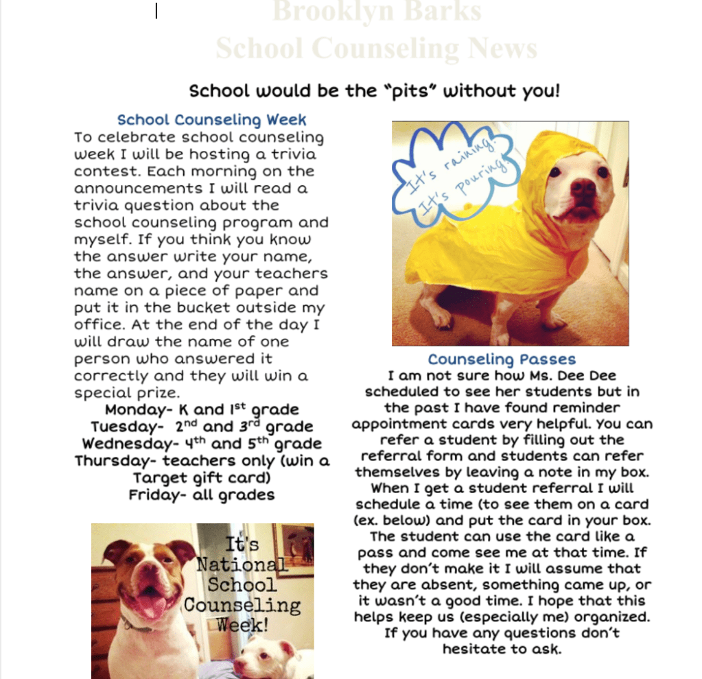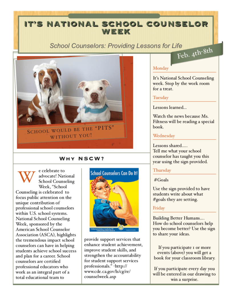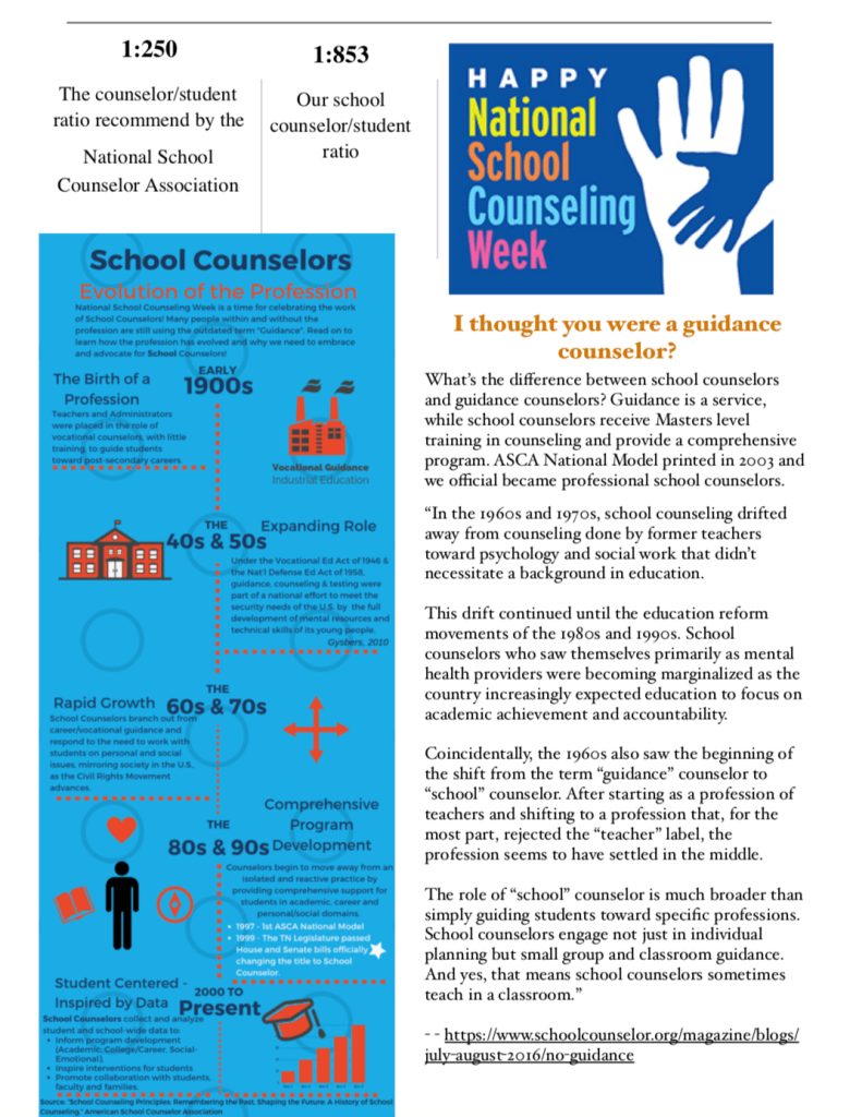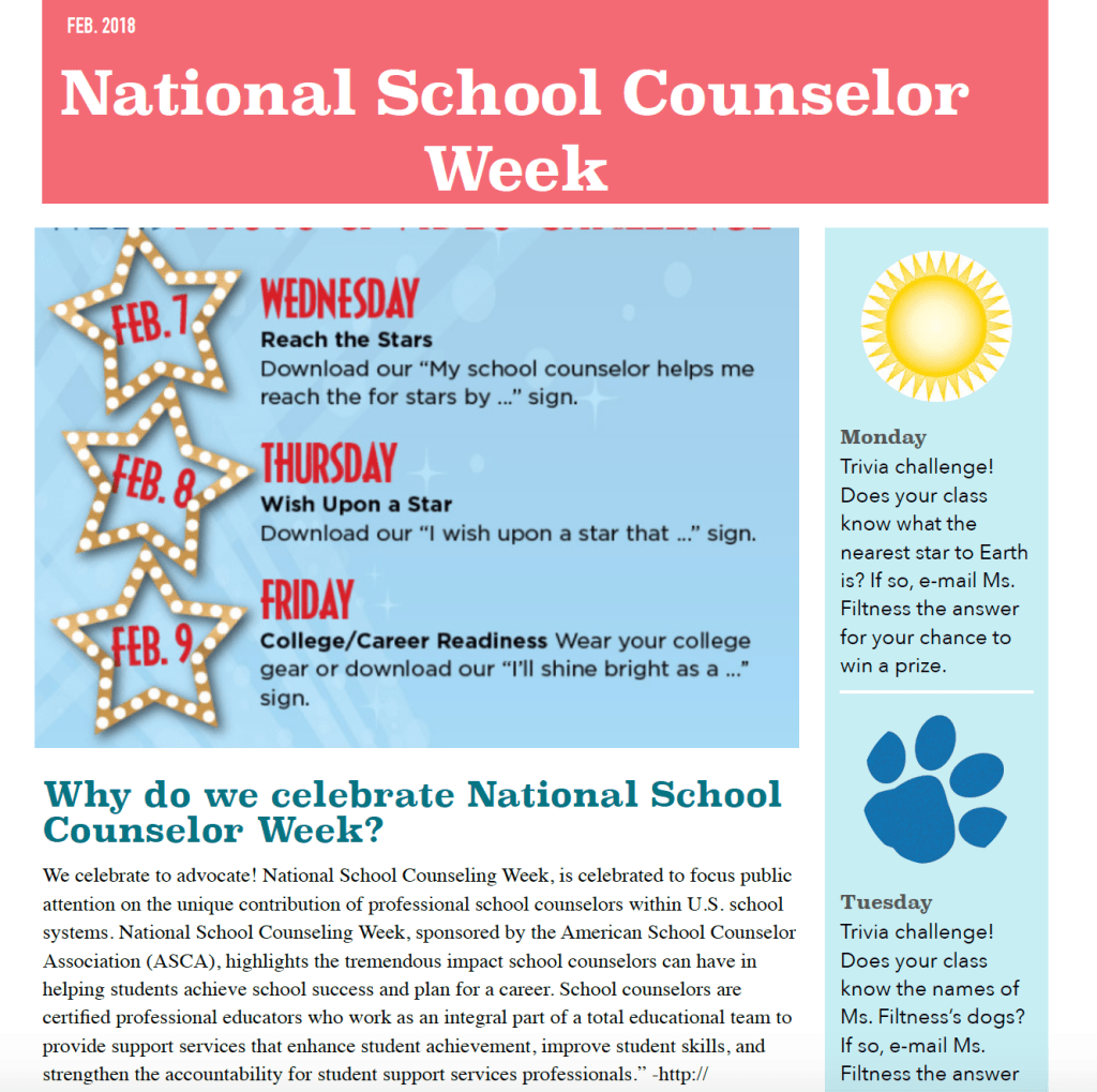 This week can be tricky because I love to share data about my program, but I don’t want to come across as “bragging.” So I use my newsletter to share with teachers information about our role and the history of school counseling and NSCW.