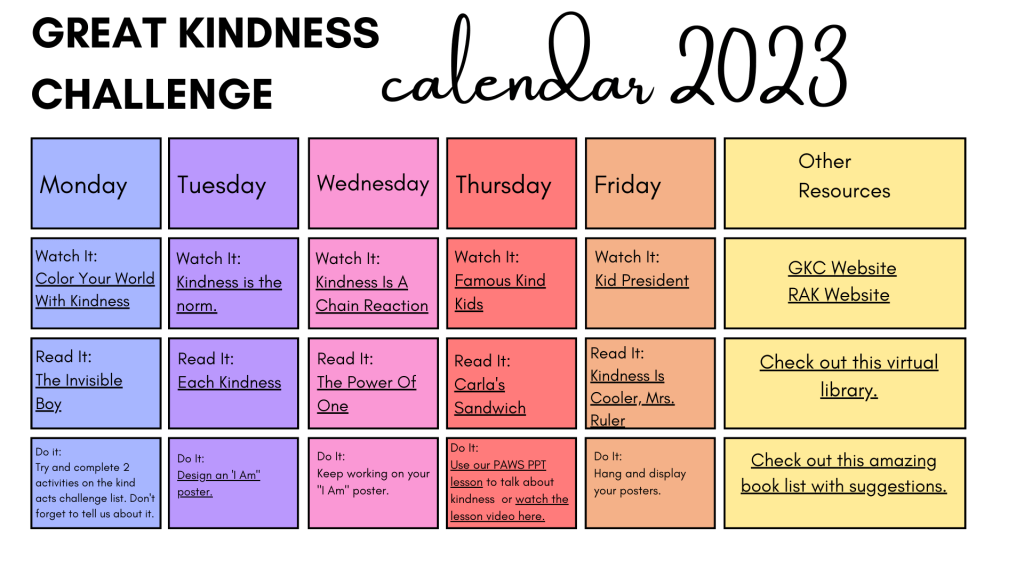Whether you are participating in the Great Kindness Challenge, Random Acts of Kindness Week, or creating your own, here are some tips and tricks to a successful kindness challenge. I’ve also included samples of what I’ve done in the past.
