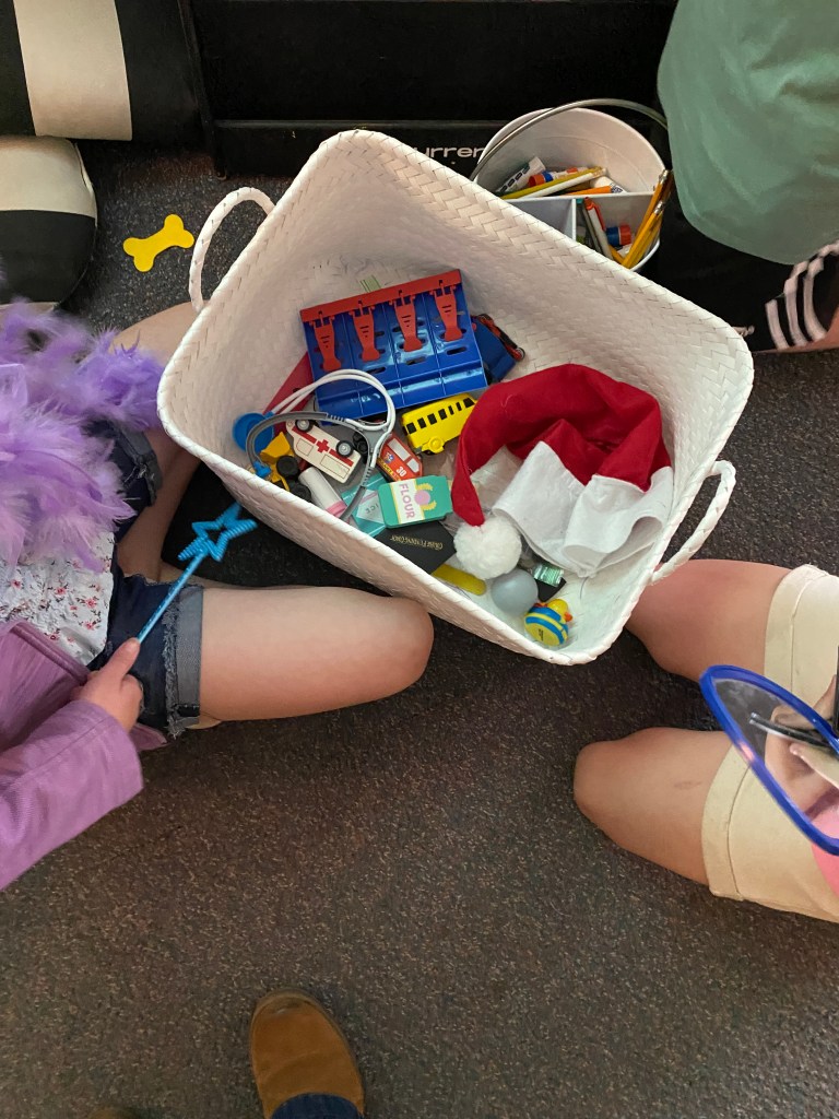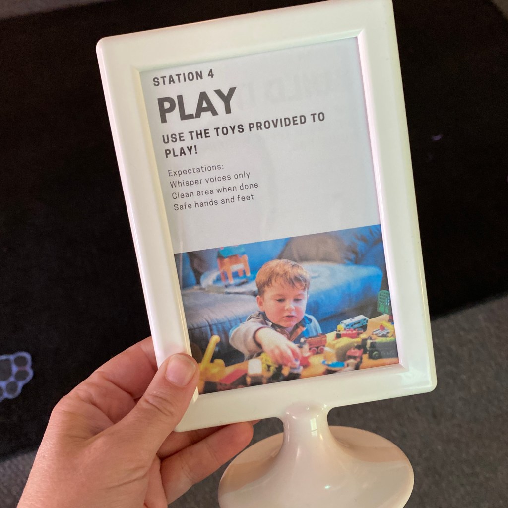 This one is a hit because kids get to be kids and play. It’s also so interesting for me to see how they play. I put out a bin with toys (mostly from the Dollar Store and Target), set clear expectations like “people are not for hitting,” and then start the timer.