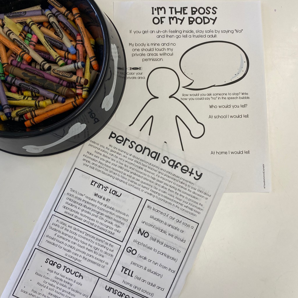 This is a great way to present a tough subject in a manner that’s kid friendly. I have students draw “bathing suits” on their person so they can visualize what I mean by “private area.”