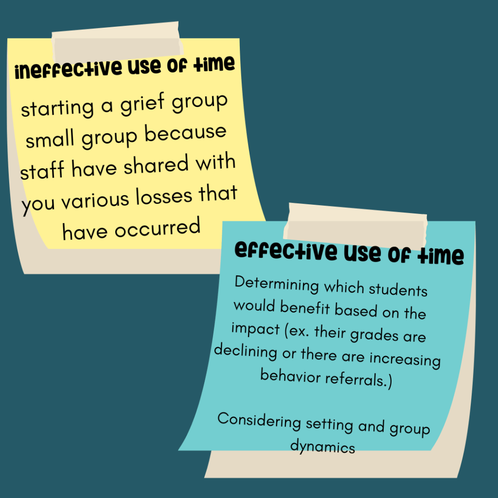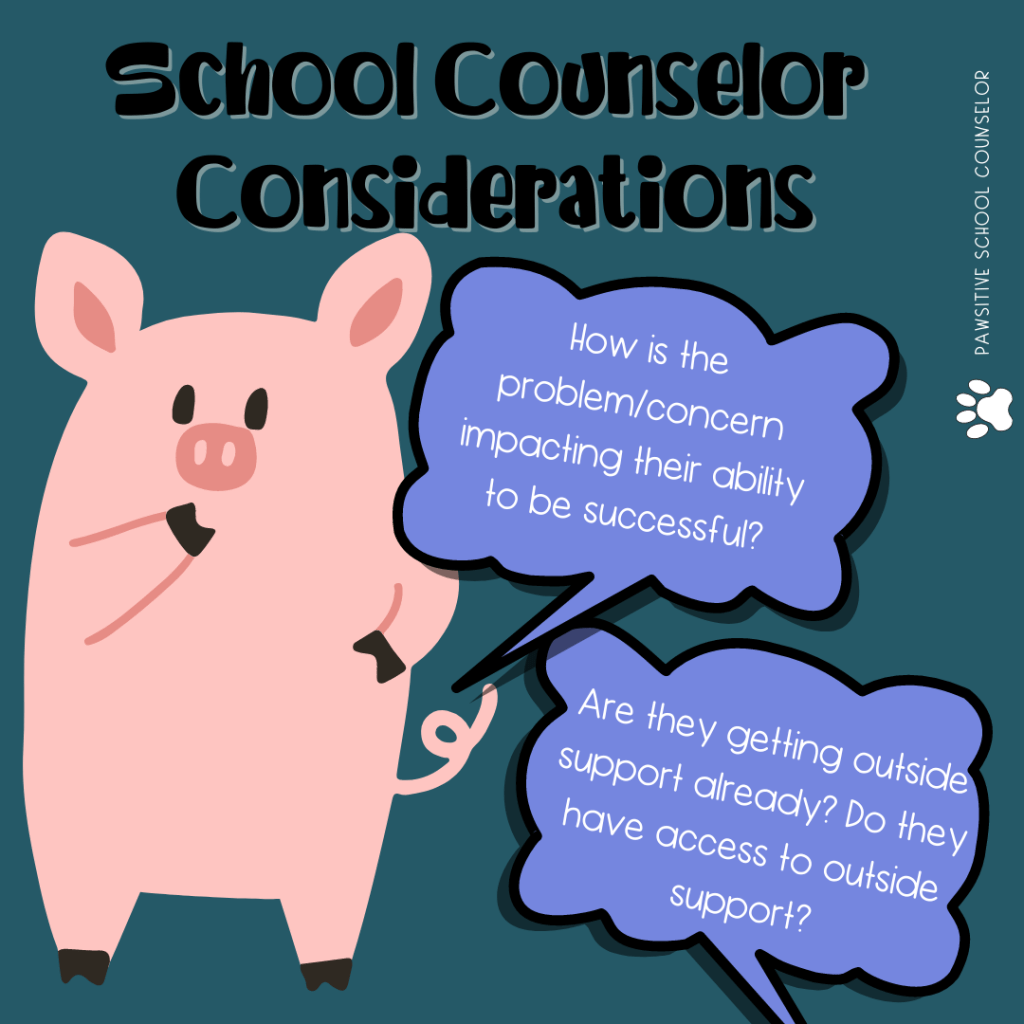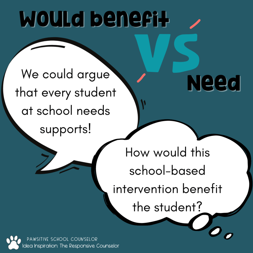 For example, when a parent divorces some students may do well keeping school a normal routine while others may benefit from small group services. I often have teachers report to me family changes (separation, incarceration, etc.) but I always pause before I jump to a service. I may need to gather more information from the family such as their access to outside resources, review the impact of the change, and monitor the student to see what response would be most beneficial.