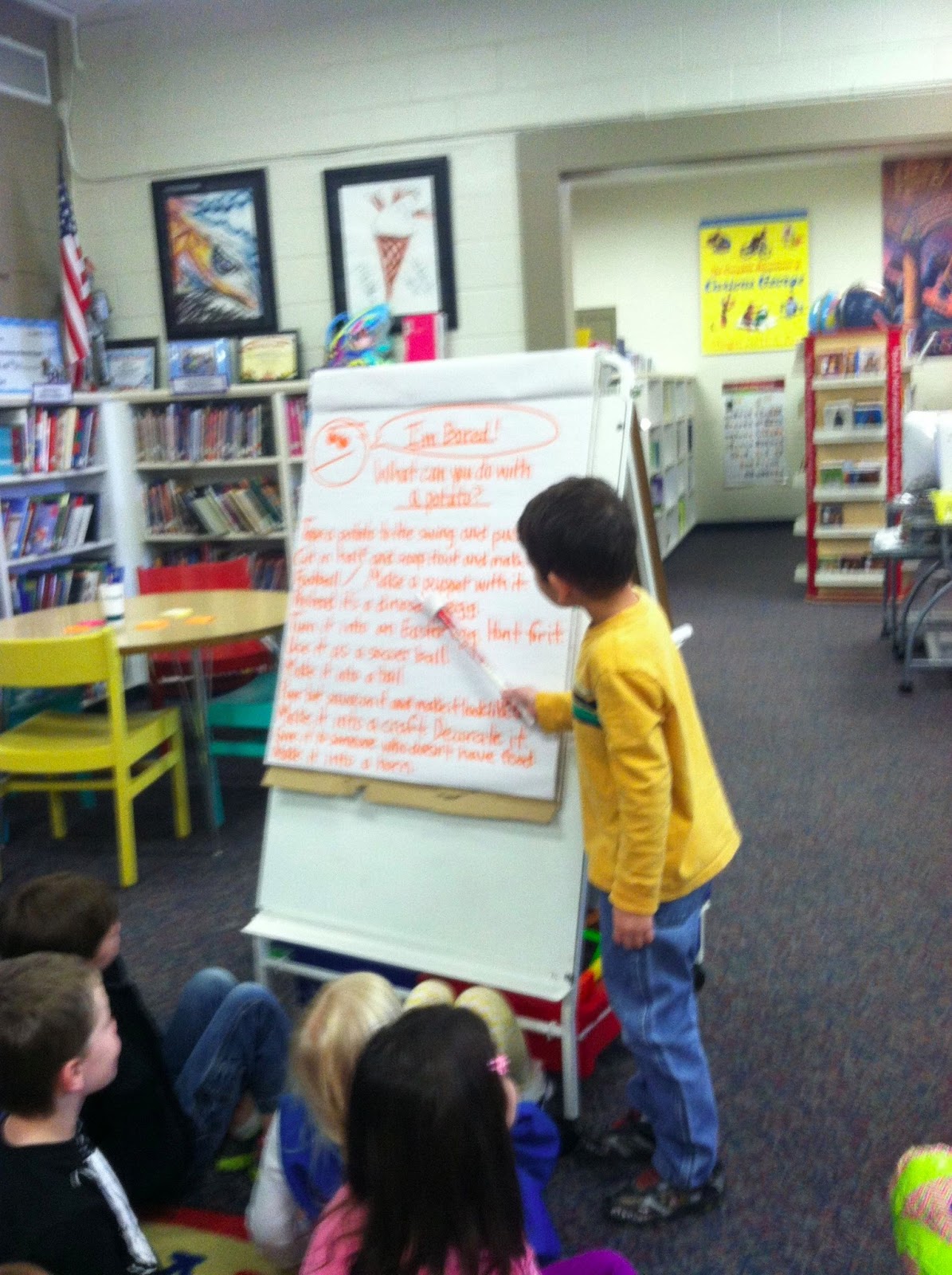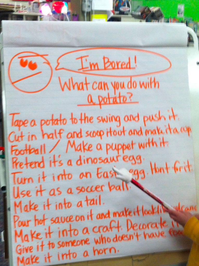 Today in guidance/counseling class we read “I’m Bored” written by Michael Ian Black and illustrated by Debbie Ridpath Ohi. In the story, the little girl is very bored and can’t think of anything to do. Then, she meets a potato who is also bored. He tells her he thinks kids are boring, too. This encourages the girl to brainstorm and imagine all of the amazing things that kids can do therefore proving to the potato that kids aren’t boring.