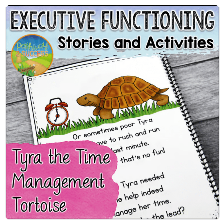 This executive functioning short story highlights skills for time management. Kids will read along with Tyra the Time Management Tortoise as they learn how to use their time well. This skill will help kids learn how to estimate how long tasks will take, put distractions away when it’s time to work, adjust your pace while working, and more.