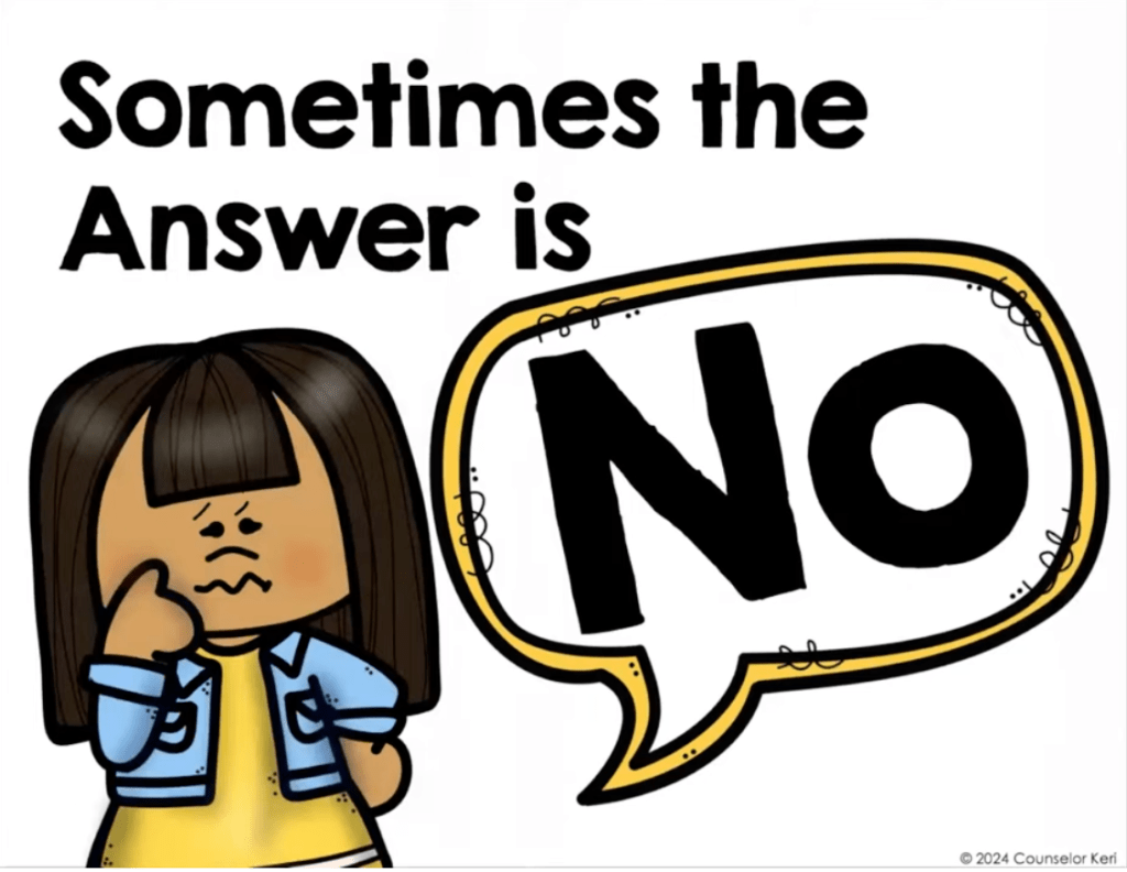 “Sometimes The Answer Is No” by Keri Powers is a fun virtual story you can watch on YouTube.