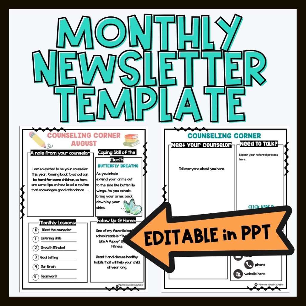 This newsletter template is in PPT and is editable, so you can personalize it. It includes a template for introducing yourself and for Aug-June.